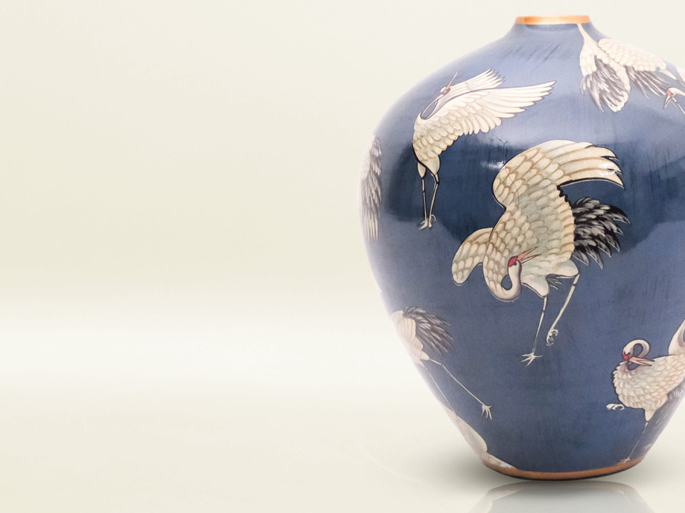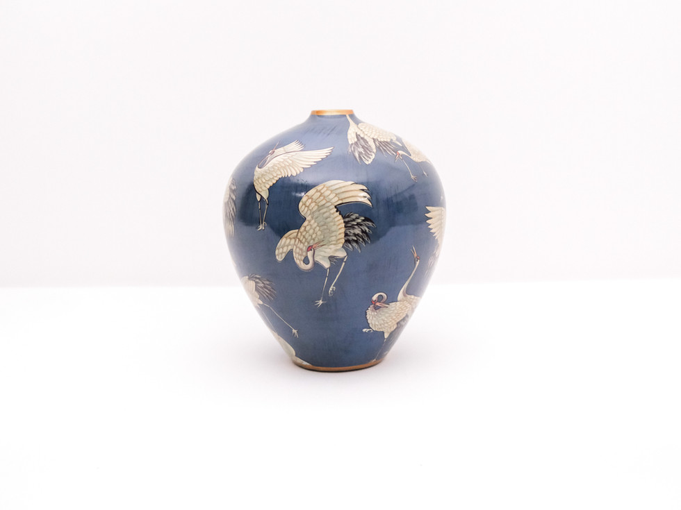 Timeless elegance meets artistic charm in this exquisite Stork Ceramic Vase. Adorned with graceful, hand-painted storks gliding across a deep navy backdrop, this statement piece captures the beauty of nature and traditional craftsmanship. The delicate gold accents add a subtle touch of luxury, making it a striking addition to any space. This vase brings a sense of tranquillity and sophistication to your home; with its rounded silhouette and smooth, high-gloss finish, it seamlessly blends contemporary aesthetics with a hint of heritage-inspired design.